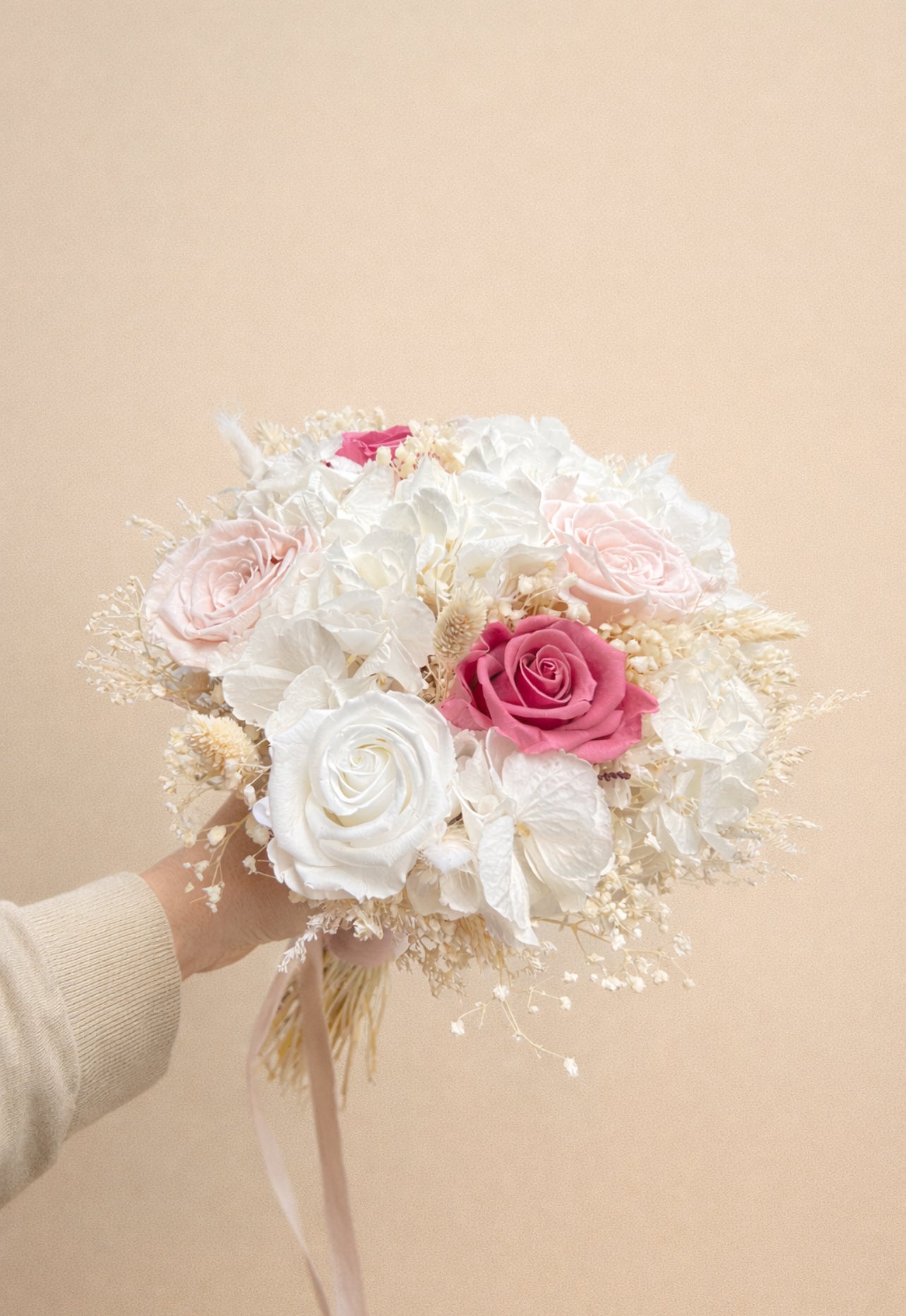 Los ramos secos se deshidratan de forma natural y tienen un aspecto más rústico y delicado. Los ramos preservados, en cambio, se tratan con una solución especial que conserva su color y textura, haciéndolos parecer frescos por más tiempo. Por lo tanto, los ramos preservados se conservan más tiempo.