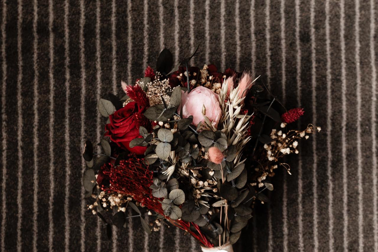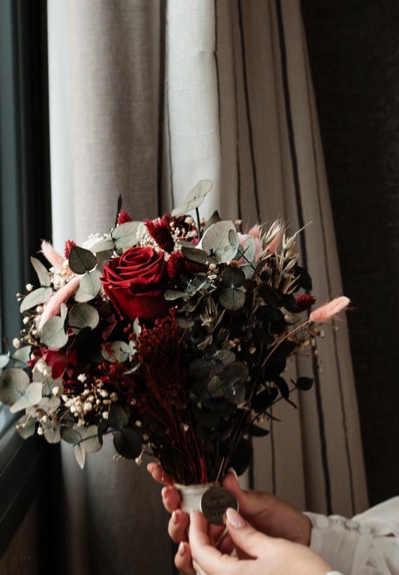 Creamos tu ramo de novia preservado personalizado. Este ramo puede ser de gran inspiración si eres una enamorada de los tonos rosas y granates.