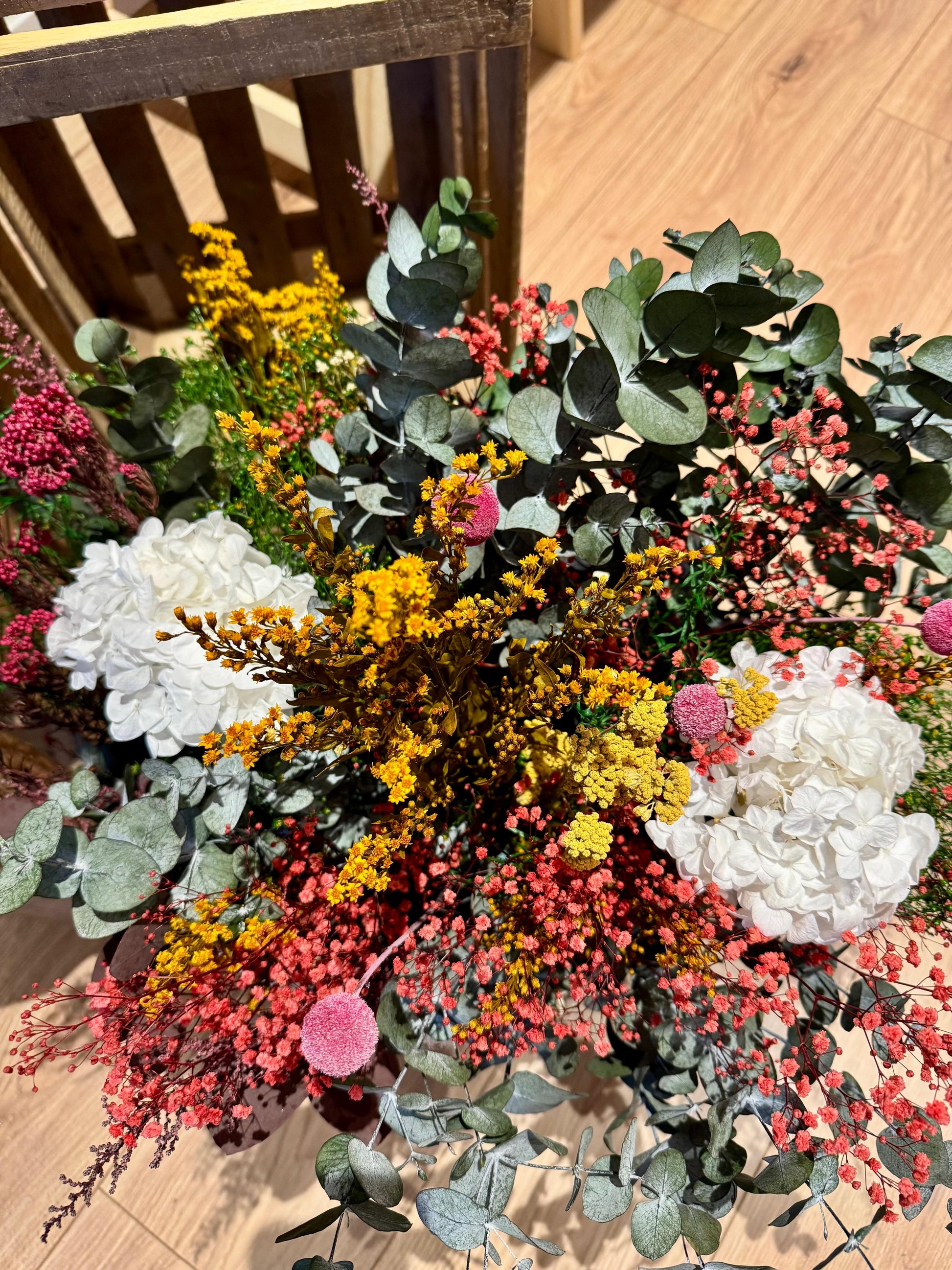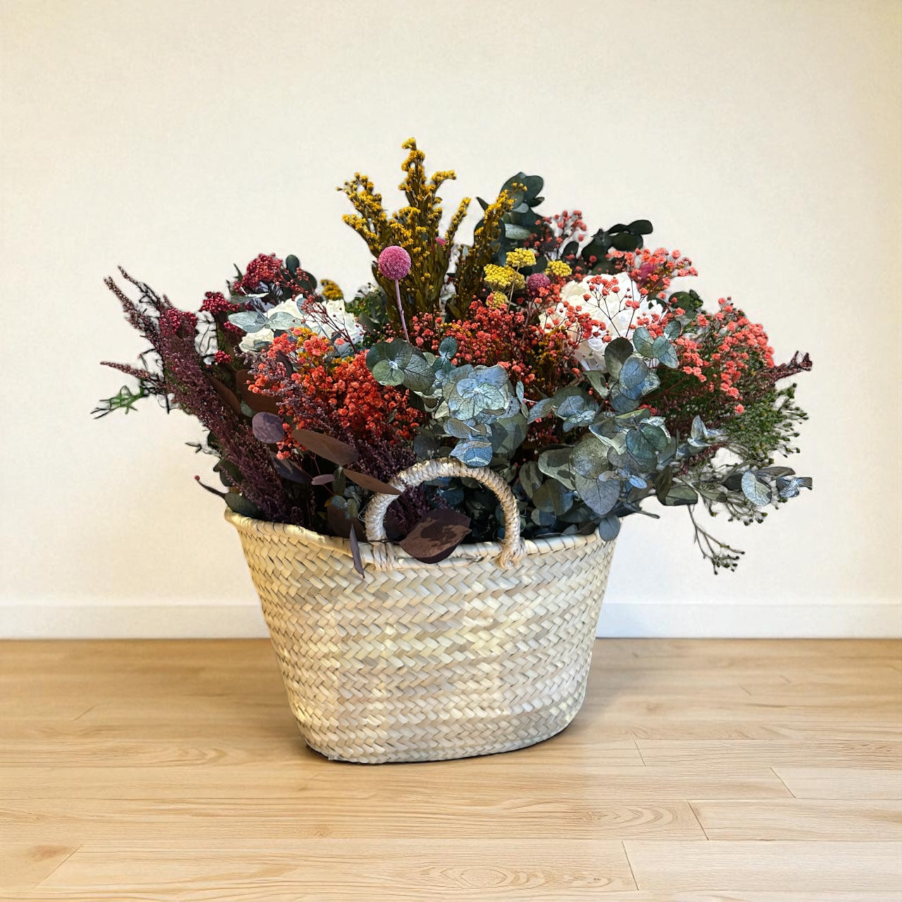 Cesta grande de flores preservadas en cálidos tonos otoñales, una pieza elegante y duradera que llena cualquier espacio de armonía y naturaleza.