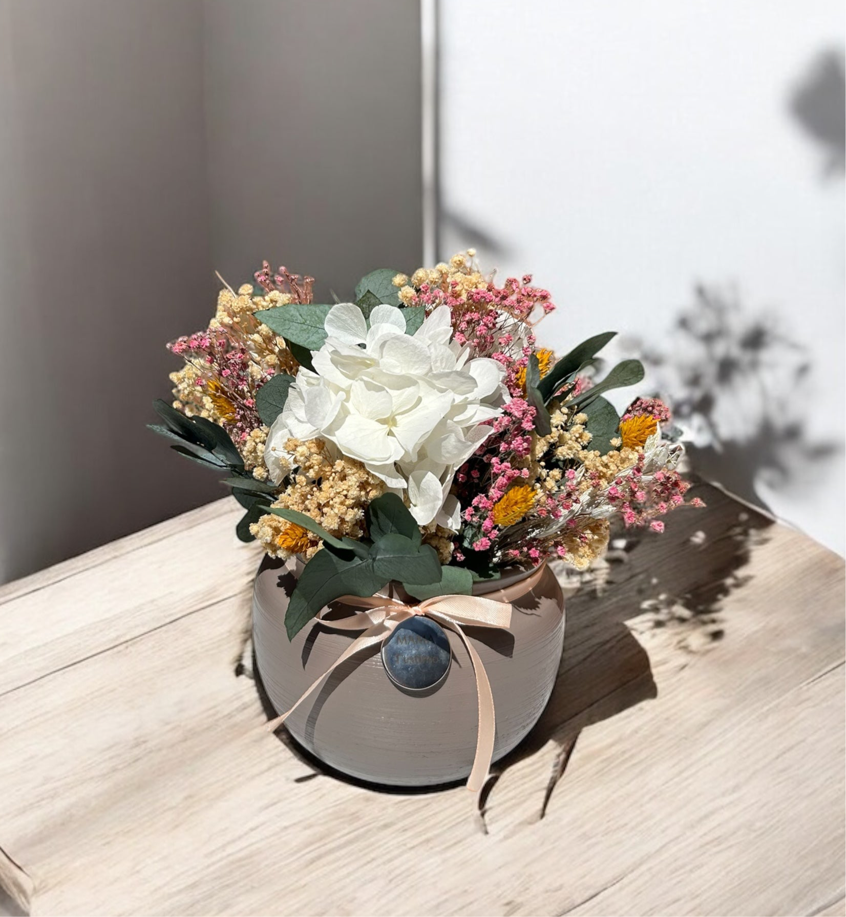 Colores suaves, belleza preservada: un centro de mesa que inspira calma y encanto.