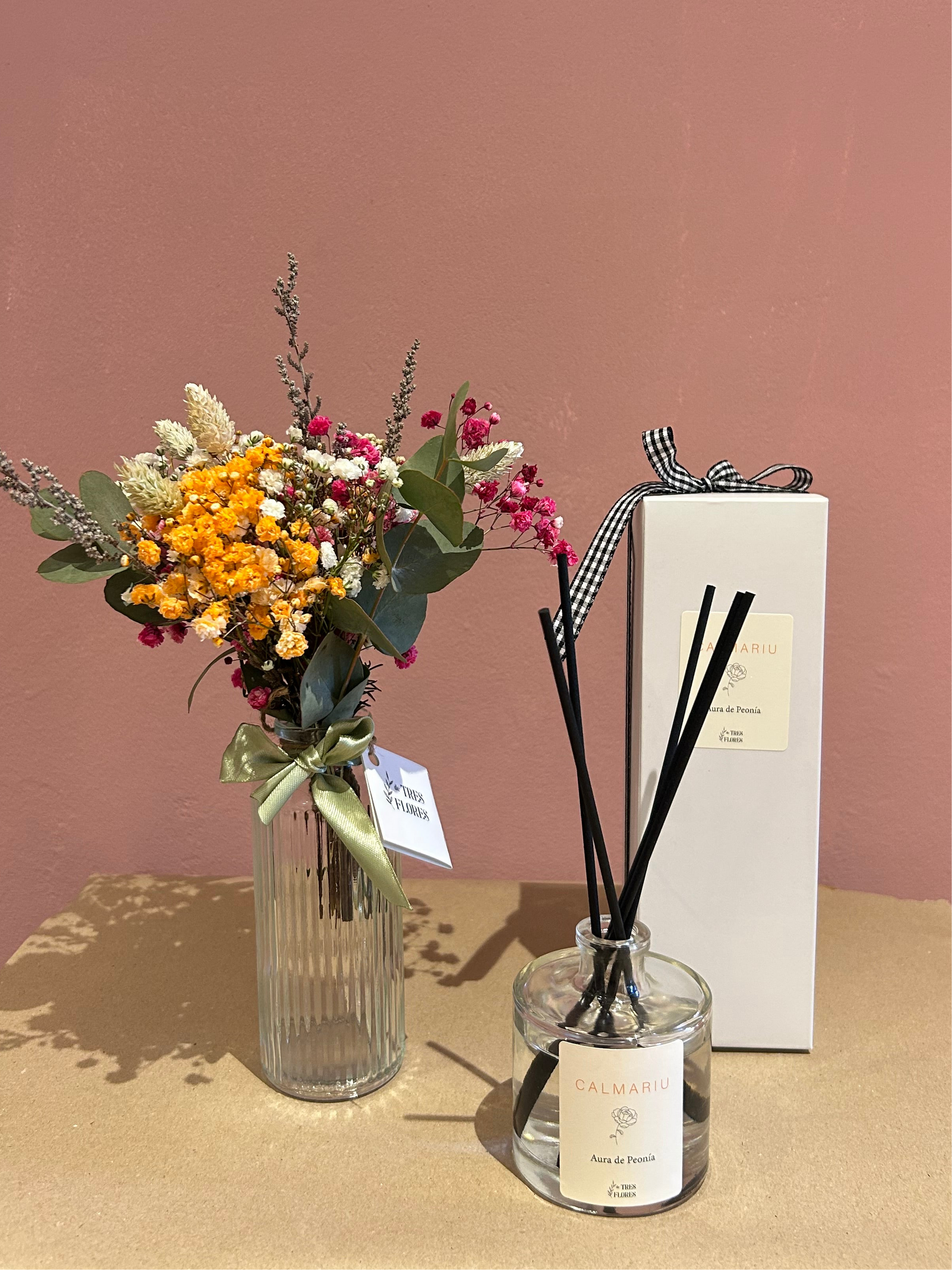 El pack incluye nuestro ambientador de mikado Calmariu y un ramo mini seco con jarrón.