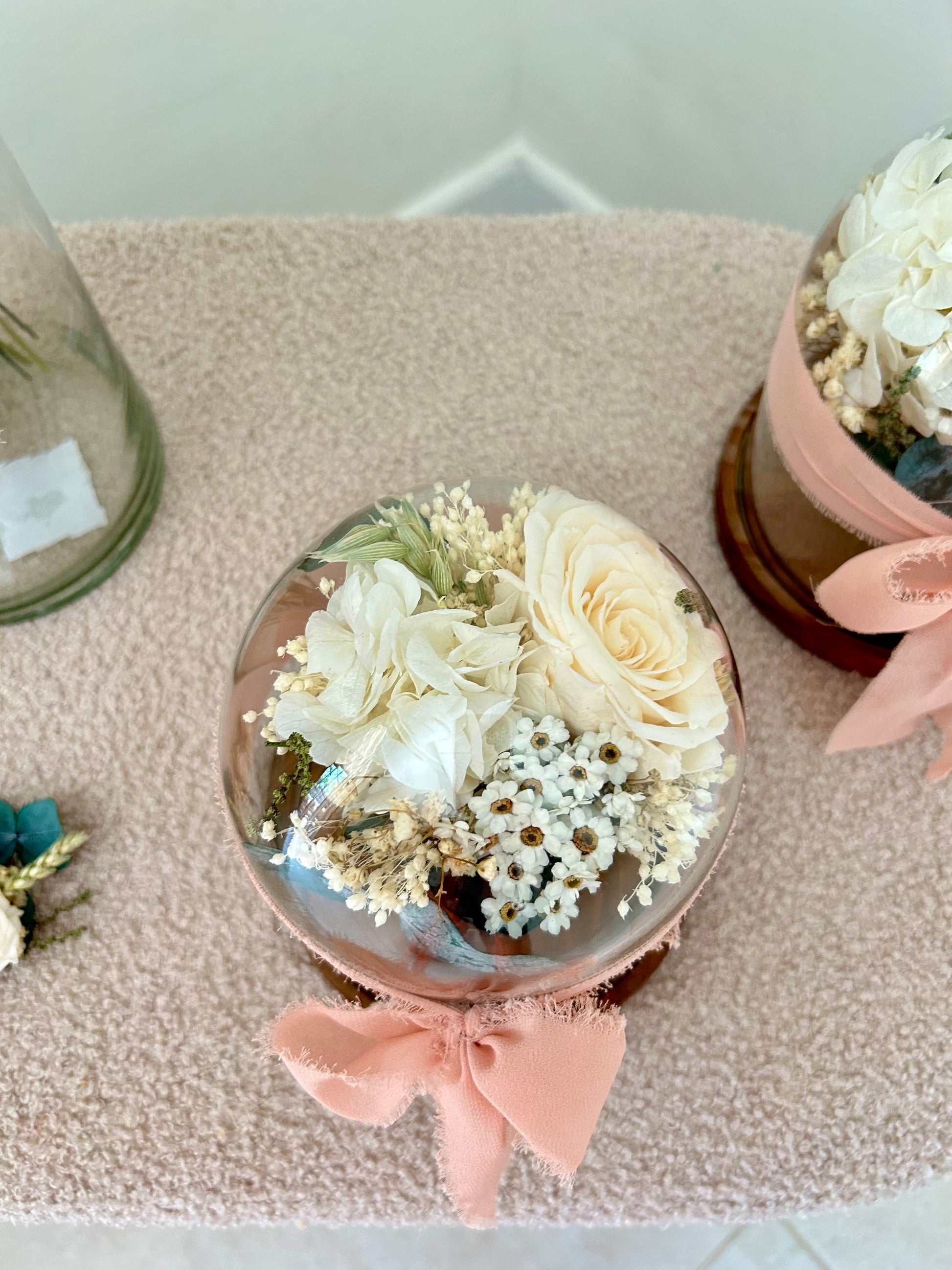 Conserva la magia de tu boda con nuestra cúpula que contiene una réplica de tu ramo de novia, hecha con flores preservadas. Disponible en tamaño pequeño o mediano, es un tesoro eterno que captura la belleza de tu día más especial. ✨💖