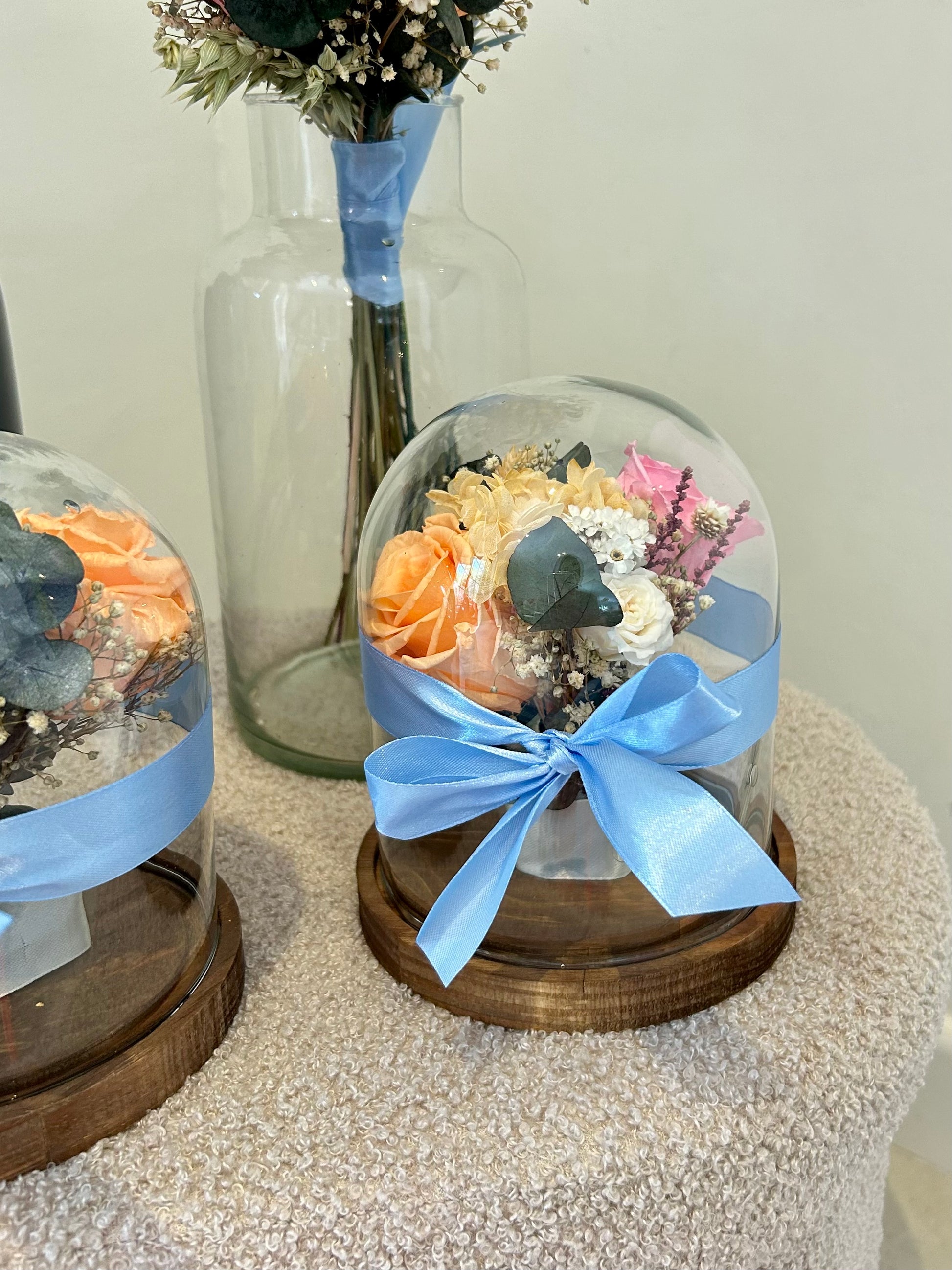 Conserva la magia de tu boda con nuestra cúpula que contiene una réplica de tu ramo de novia, hecha con flores preservadas. Disponible en tamaño pequeño o mediano, es un tesoro eterno que captura la belleza de tu día más especial. ✨💖