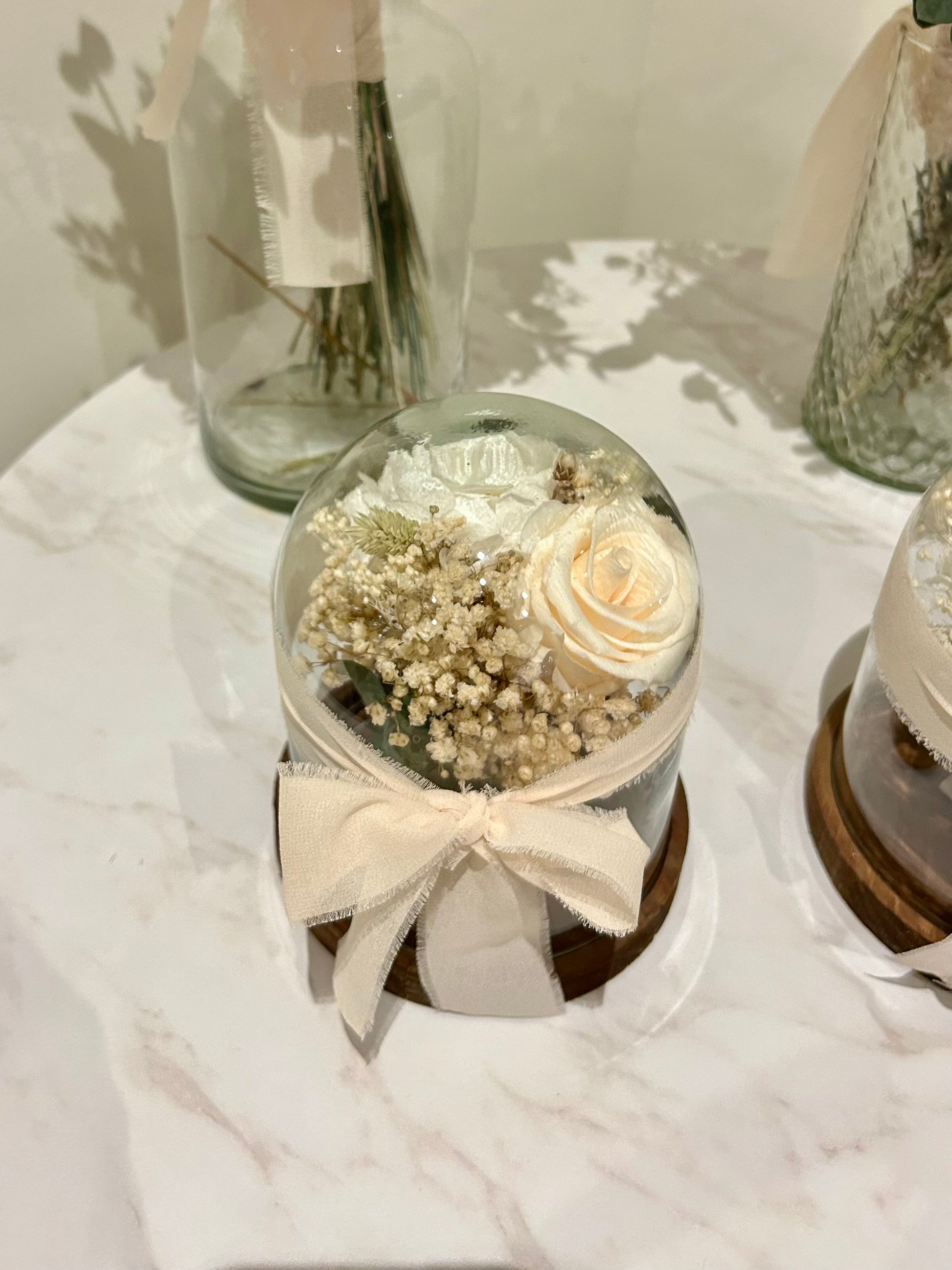 Conserva la magia de tu boda con nuestra cúpula que contiene una réplica de tu ramo de novia, hecha con flores preservadas. Disponible en tamaño pequeño o mediano, es un tesoro eterno que captura la belleza de tu día más especial. ✨💖