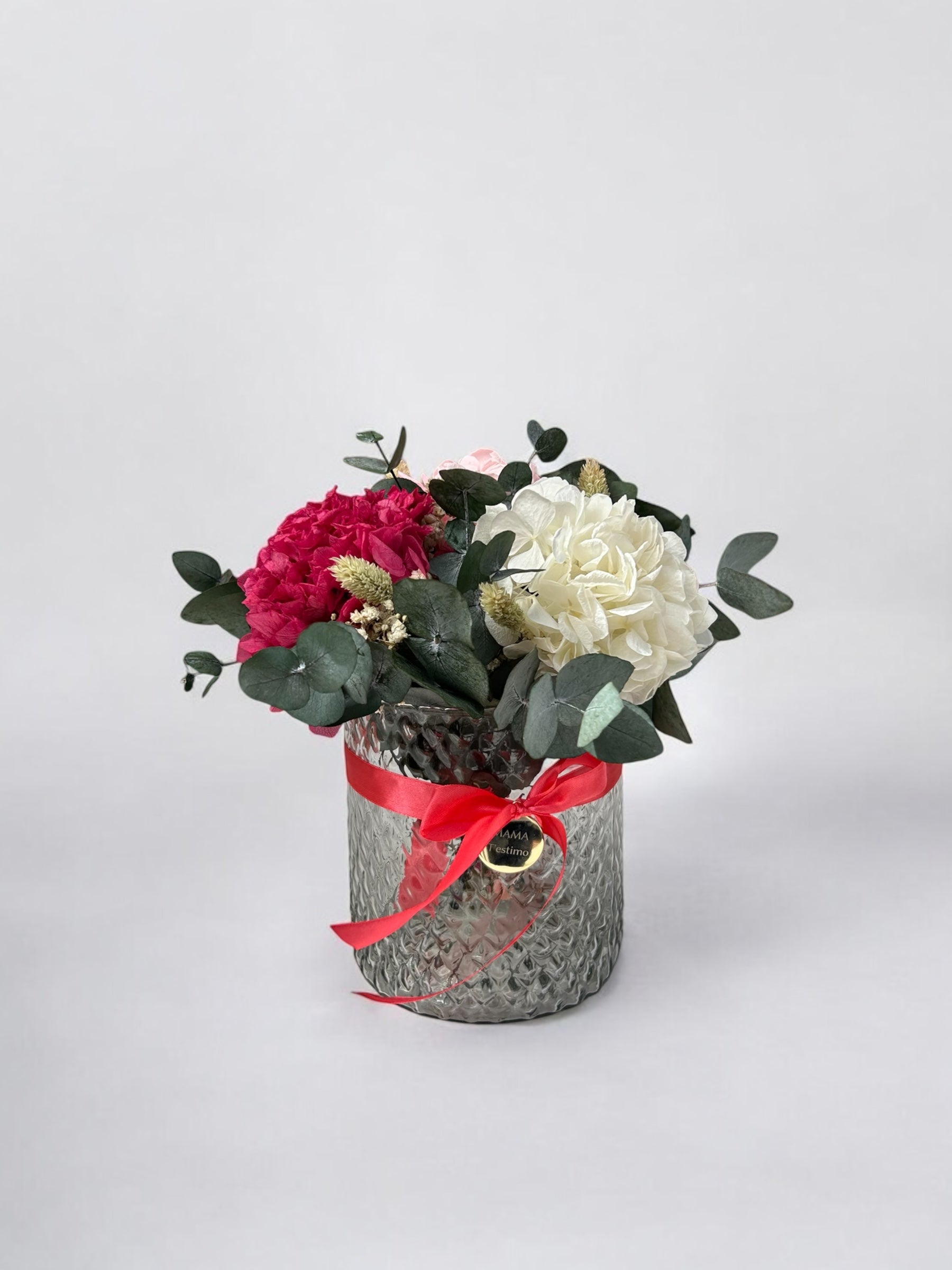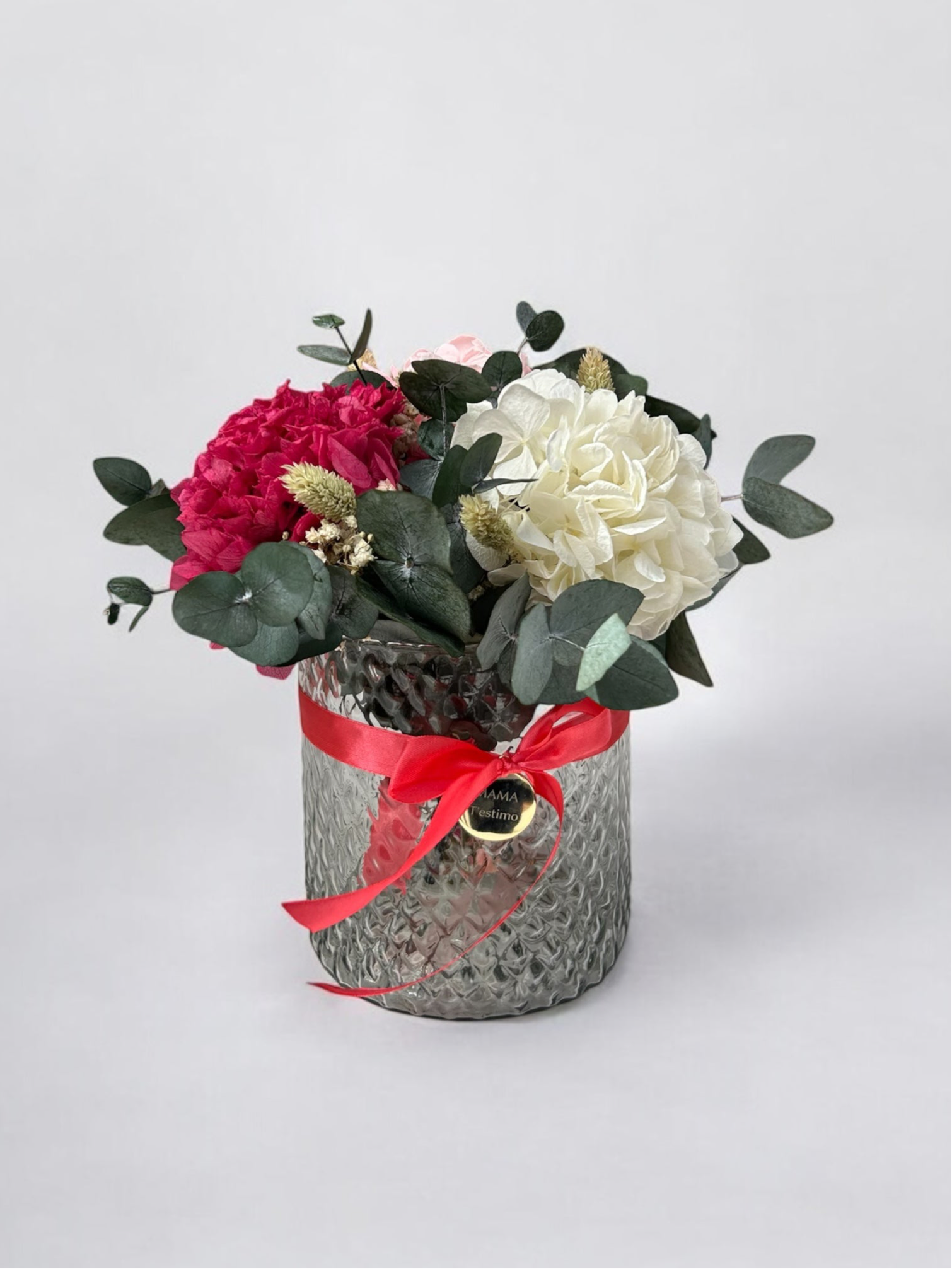 Composición: hortensias blancas y buganvilla, eucalipto, phalaris.