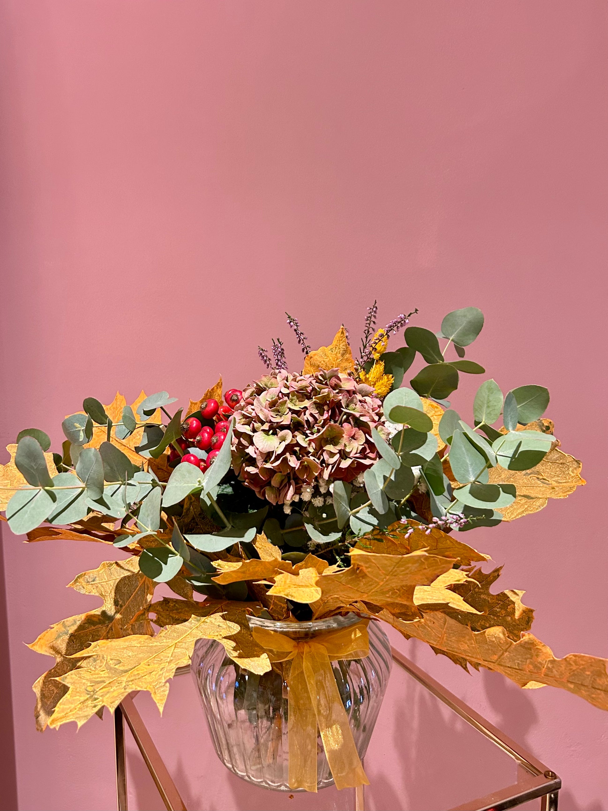 Composición: eucaliptos, hortensia, follaje otoñal.