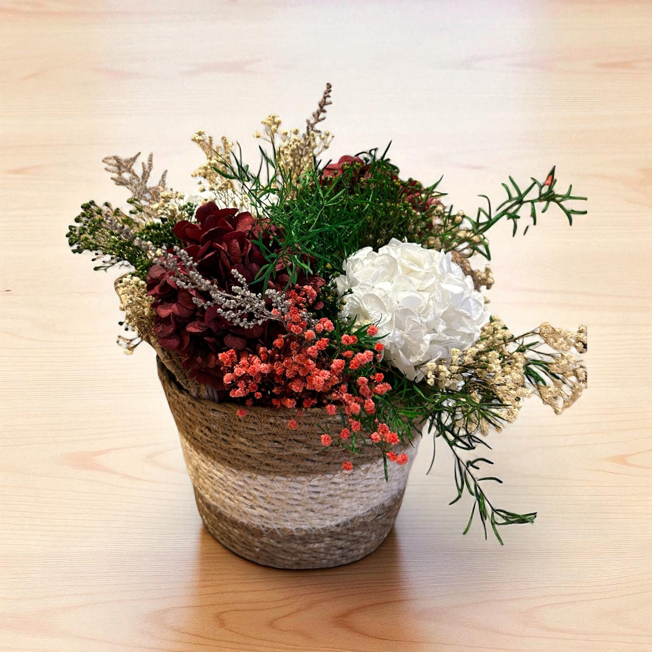 Cobre, ocre y terracota: el alma del otoño en una cesta con flores preservadas.