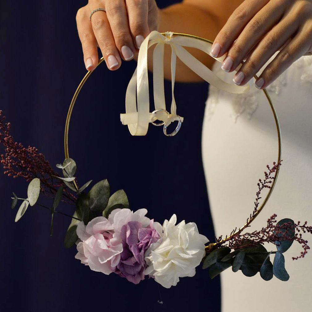 Completa tu look nupcial con un toque único y natural: nuestro porta alianzas con flores preservadas, el complemento perfecto para tu boda. Personalizamos los colores y el lazo para que se ajuste perfectamente a tu estilo y a la armonía de tu boda, creando un detalle exclusivo y lleno de elegancia.