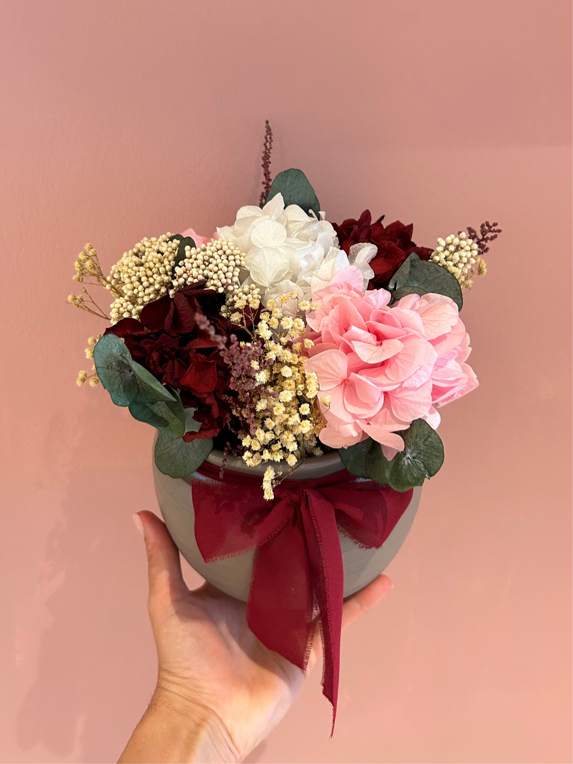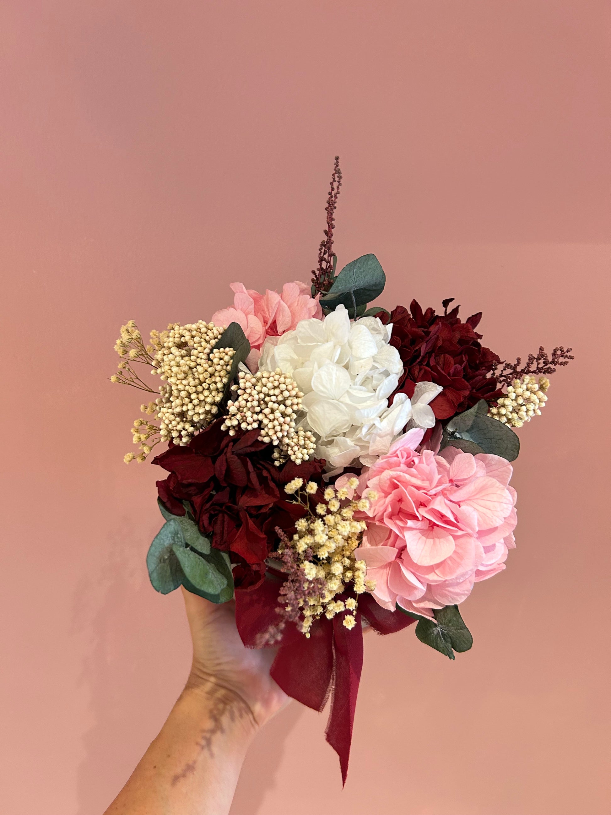 Composición: hortensias, paniculata blanca, eucalipto, phalaris.
