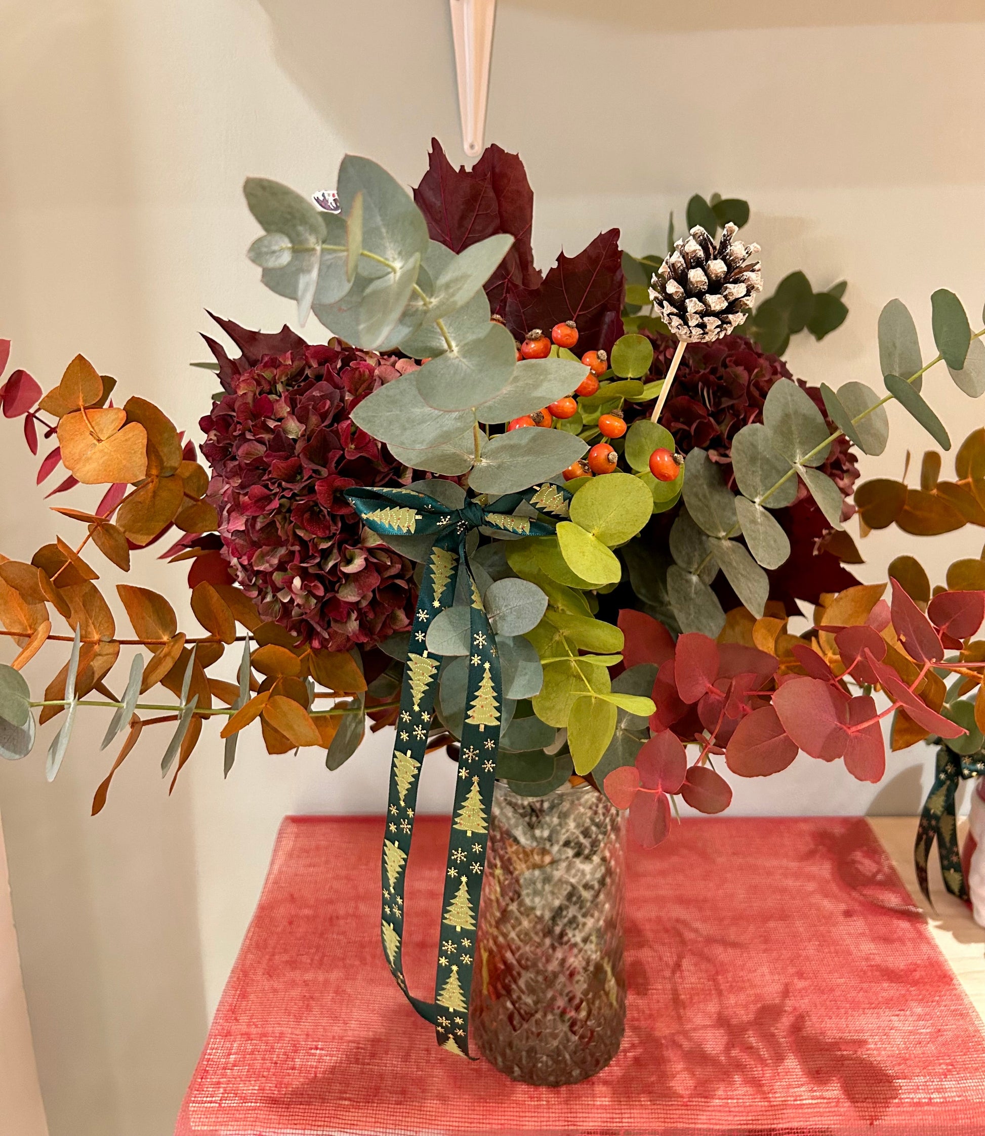 Composición: Eucaliptos, hortensias, gabarro, piñas, papá Noel.
