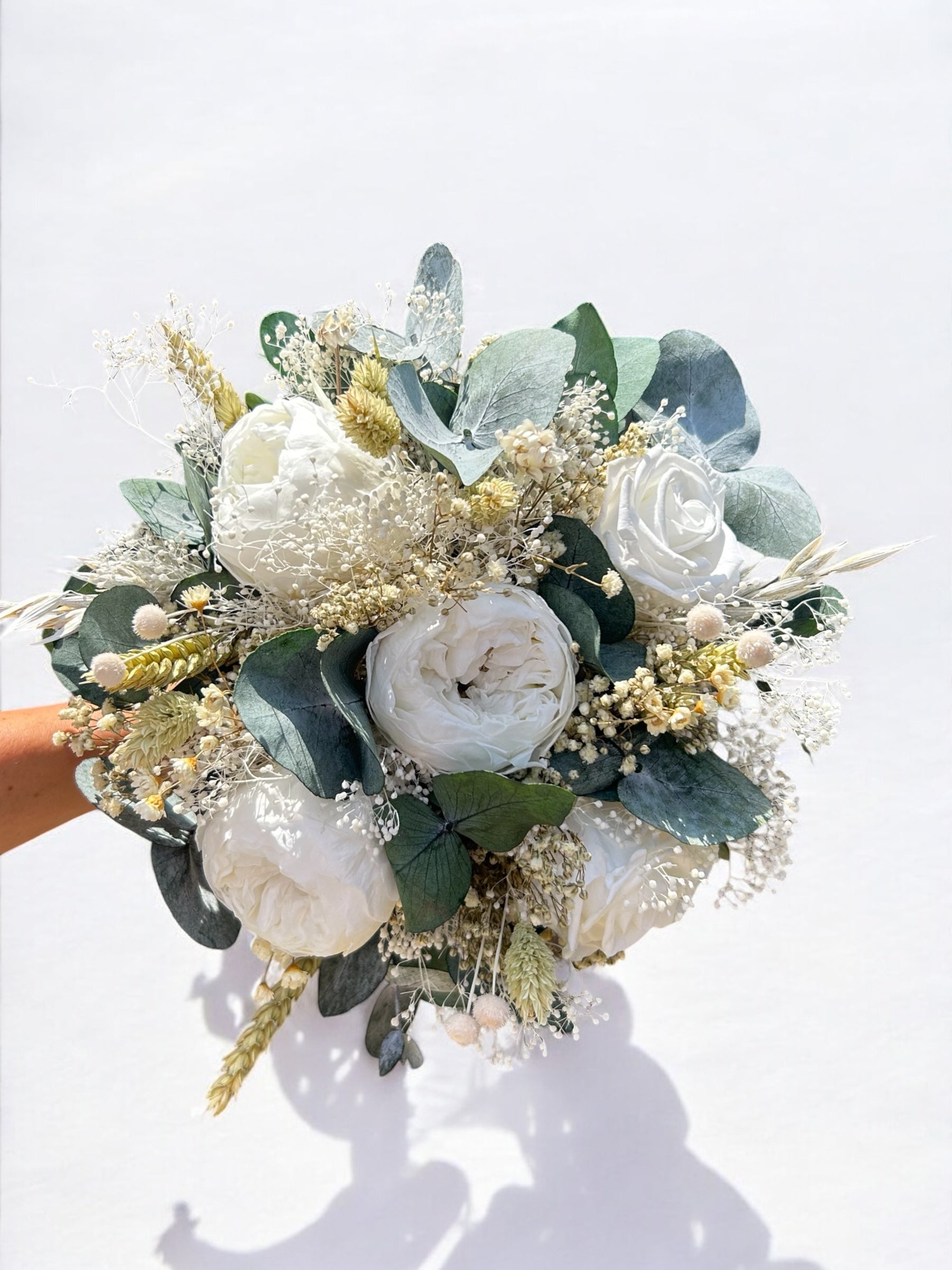 Creamos tu ramo de novia preservado personalizado. Este ramo puede ser de gran inspiración si quieres un ramo elegante con peonías.