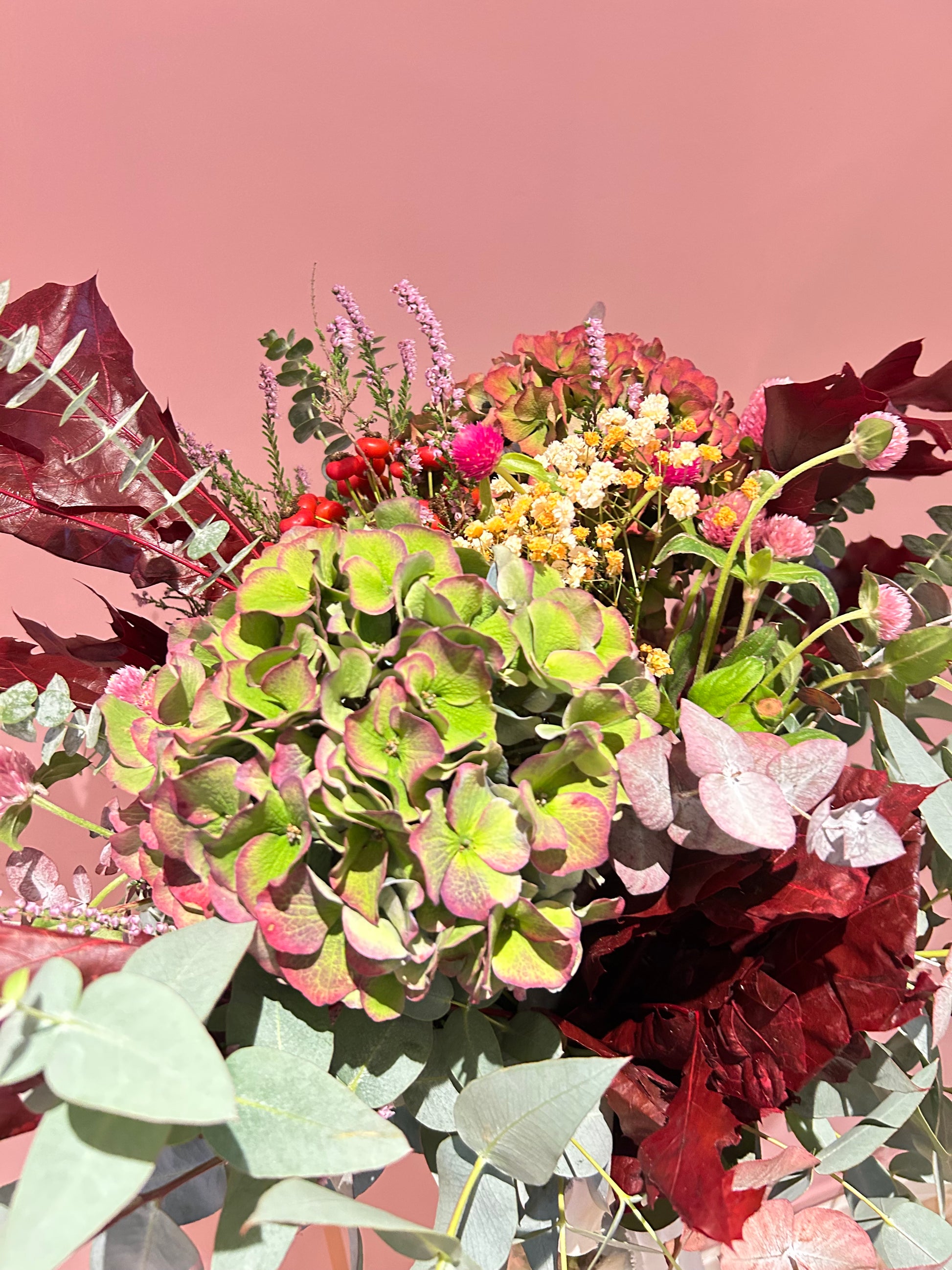 Composición: paniculata blanca, fucsia, azul, naranja, pampas, craspedias, rosa preservada blanca, eucalipto, lavanda, trigo.