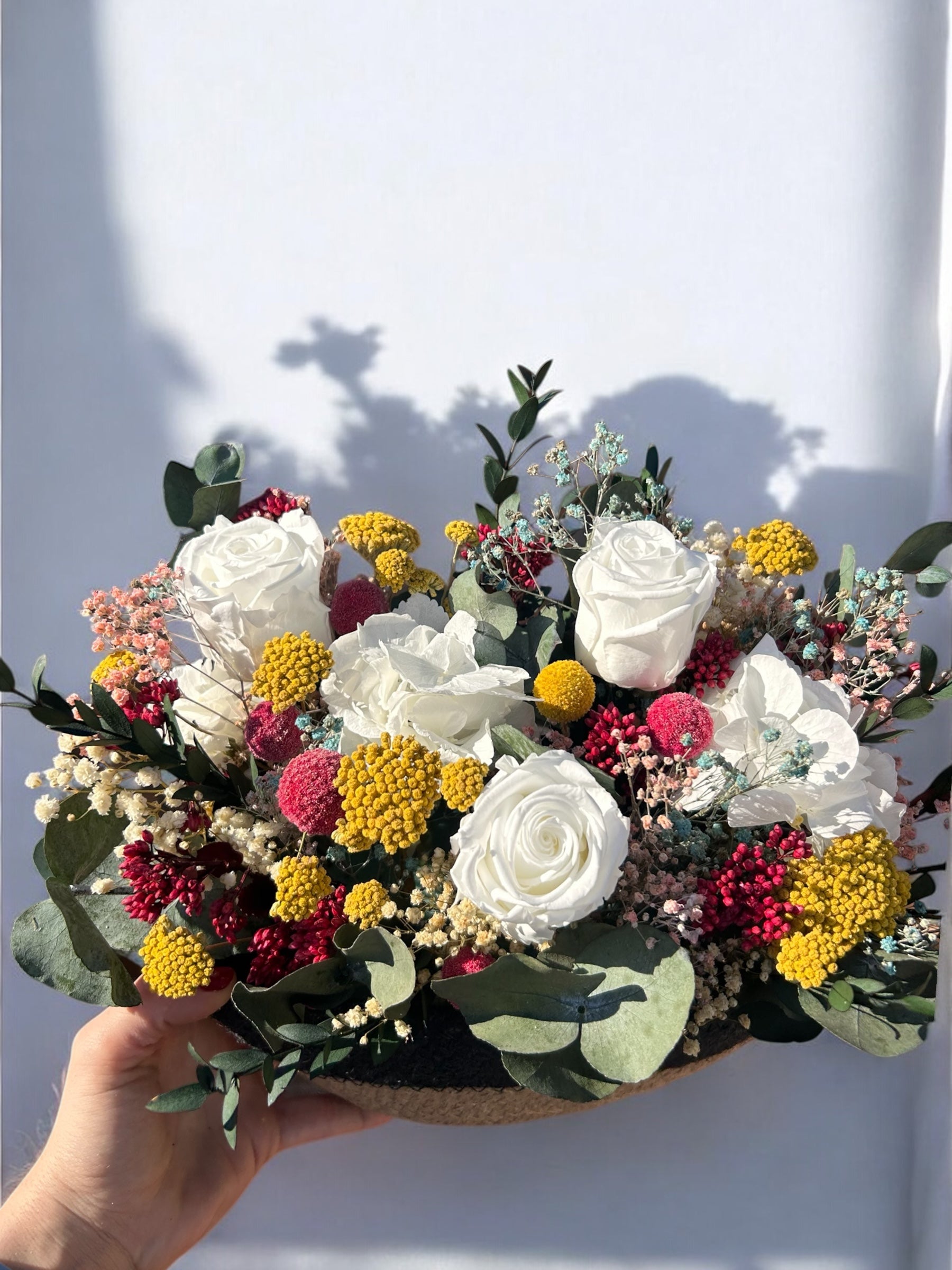 Cesta de flores preservadas, belleza que perdura. Perfecta combinación colorida para darle color a tu hogar.